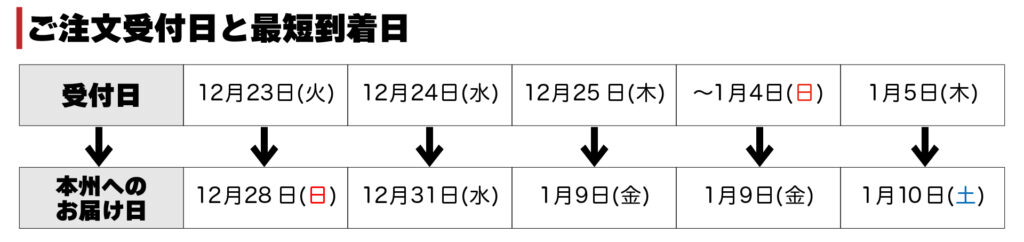 ※北海道方面のお届け日は、上記本州へのお届け日より1日早くなります