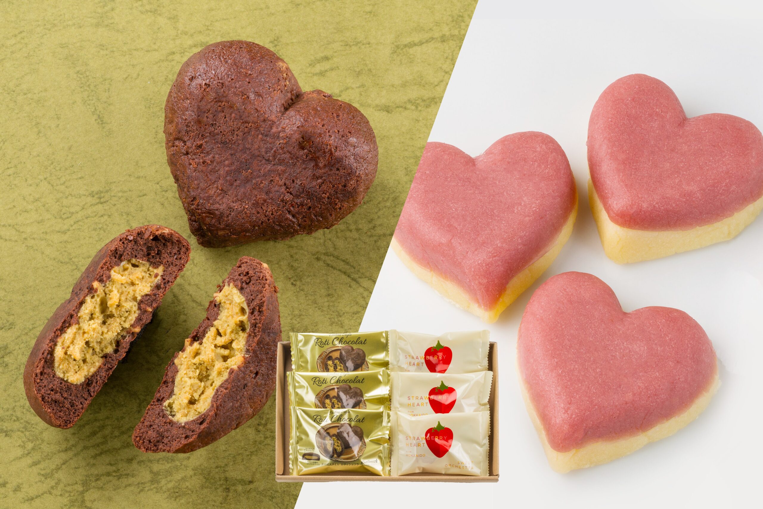 チョコレート生地でなめらかなピスタチオのペーストとザクザクとした食感 のカダイフ(極細の麺状生地)風素材を包み焼き上げた「ドバイスタイルロティショコラ」と、北海道産の苺を使用した苺ペーストをベイクドショコラ風の生地の上に盛り付け焼き上げた「ストロベリーハート」をセットにしました。